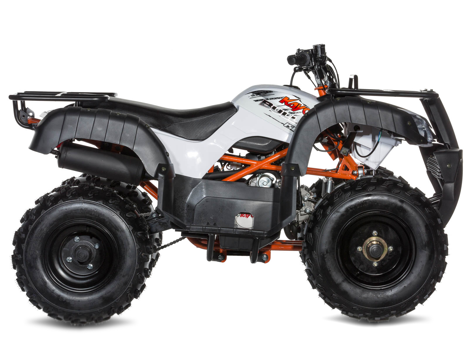 They succeeded and the result is an ATV that plenty of bottom end grunt, is light, nimble, has amazing crawling & climbing ability, rugged looks and a price that will make your jaw drop. The utility quad has plenty of load space & a detuned 150 cc YX race engine for lugging stuff around Forget about what you think you know about quads, Kayo just re-wrote the rule book. Suitable for riders of 10 years and over. 3 speed manual 150 cc 4-stroke, 1 speed reverse, 3 hydraulic disk brakes, and double wishbone suspension with adjustable pre load. Front & Rear carry racks with wrap-around plastics to keep you dry.